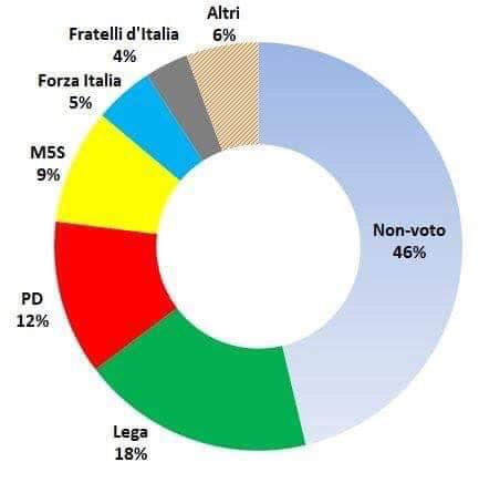 La terza valutazione da fare è sul piano interno. Apparentemente il governo si è rafforzato: a marzo 2018 la somma di 5stelle e Lega faceva il 50% dei votanti, questa volta – a pesi invertiti – fa 51,2%. Peccato, però, che in termini di voti assoluti, i due partiti di governo abbiano perso, sommati insieme, 2 milioni e 714 mila voti rispetto all’anno scorso, il 16% in meno. Segno che la fiducia degli italiani è scesa, e non di poco, altro che salita. I 5stelle sono stati pesantemente puniti, sia per essersi alleati con Salvini sia per come hanno indossato i panni degli uomini di governo (o anche per il solo fatto di averli indossati). Mentre il voto alla Lega – che in termini assoluti si è incrementato rispetto alle politiche dell’anno scorso del 60%, non del 100% come farebbe pensare il confronto tra le due percentuali, 17% e 34% – sembra voler dire a Salvini molto più “sbrigati a mollare Di Maio” che non “continua così”.